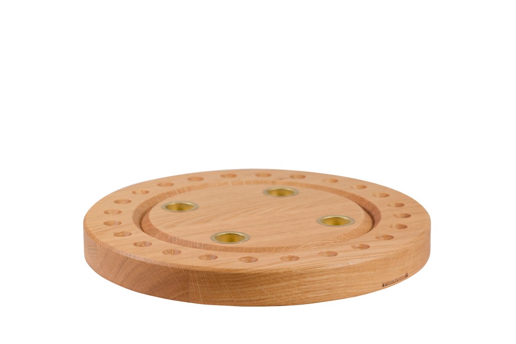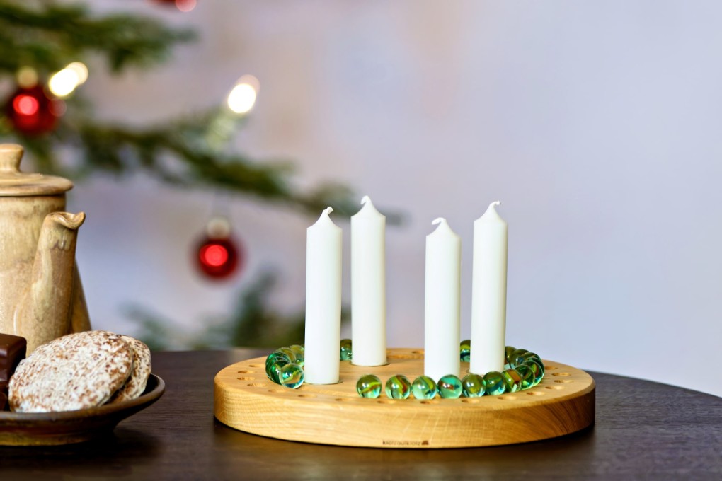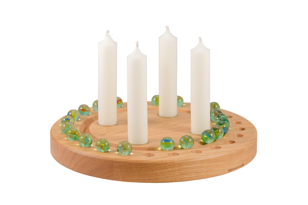 It consists of a round wooden dish with four candle holders in the centre and a circle of grooves for 24 marbles - one for each day. Count down to Christmas!